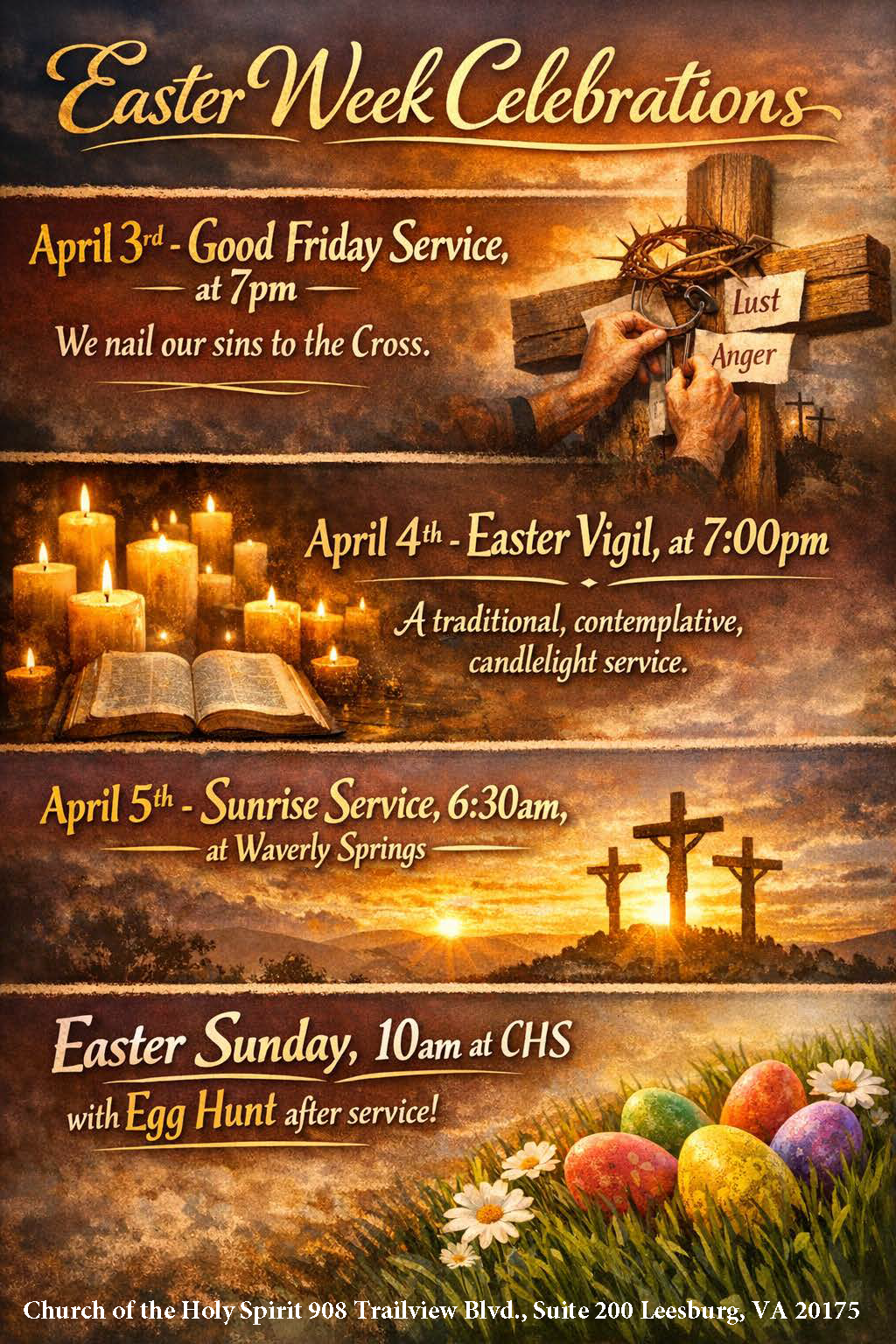 April 4th - Easter Vigil, at 7:00pm. A traditional, contemplative, candlelight service